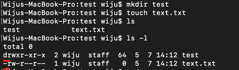 아래 사진을 보면, test 라는 디렉토리와 test.txt 라는 텍스트 파일이 존재한다.